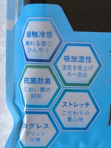 その吸湿性・放湿性以外の機能もパッケージ表面には記載があり、接触冷感や抗菌防臭等の機能も含まれていると記載されています。