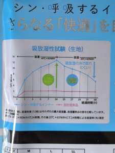 裏面のパッケージには、実際この製品を着用し、吸湿性と放湿性が時間経過によってどうなったかというのを、グラフを用いて表したデータが載っています。